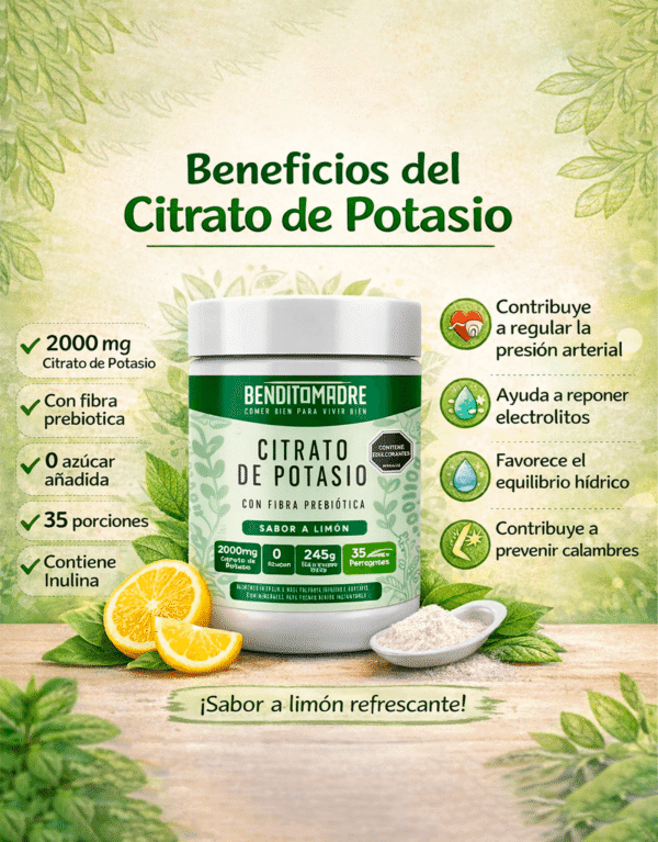 El Citrato de Potasio con fibra prebiótica de BenditaMadre es una bebida funcional perfecta para mantener el equilibrio electrolítico, apoyar la salud muscular y cuidar la función nerviosa y renal.