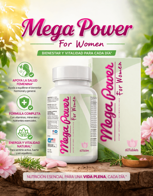 Mega Power For Women es un multivitamínico completo diseñado para cubrir las necesidades nutricionales de la mujer moderna, aportando energía, fortaleciendo el organismo y mejorando la salud integral día a día.