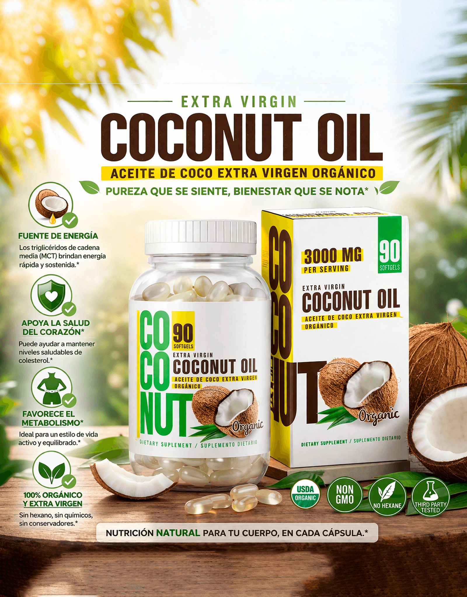 El aceite de coco orgánico es una fuente natural de energía que apoya el metabolismo, la salud cardiovascular y el bienestar general gracias a sus ácidos grasos esenciales de rápida absorción.