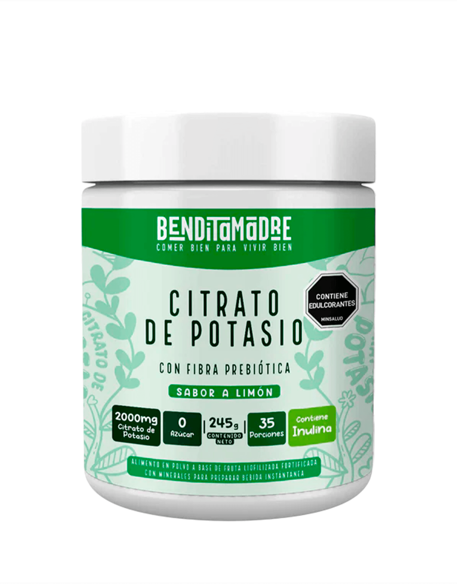 El Citrato de Potasio con fibra prebiótica de BenditaMadre es una bebida funcional perfecta para mantener el equilibrio electrolítico, apoyar la salud muscular y cuidar la función nerviosa y renal.