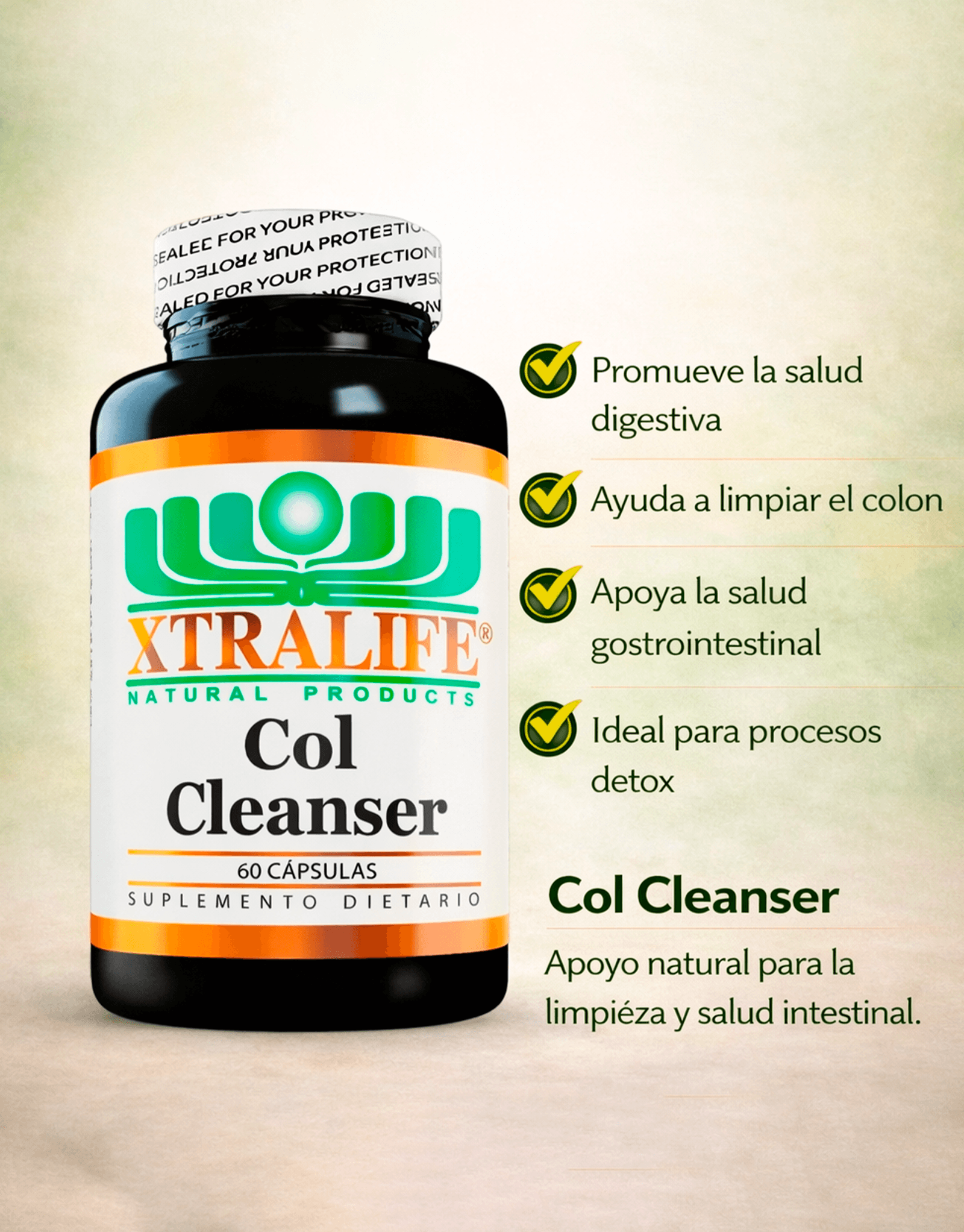 Col Cleanser Xtralife es un suplemento natural diseñado para desintoxicar el colon, promover una digestión saludable y mejorar el tránsito intestinal. Su fórmula equilibrada apoya la limpieza interna del sistema digestivo y favorece la eliminación de residuos acumulados.