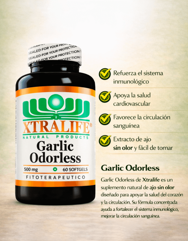 Este suplemento ofrece todos los beneficios del ajo tradicional sin el olor desagradable, gracias a su fórmula inodora. Es ideal para quienes desean aprovechar sus propiedades sin afectar su aliento o sabor al consumirlo.