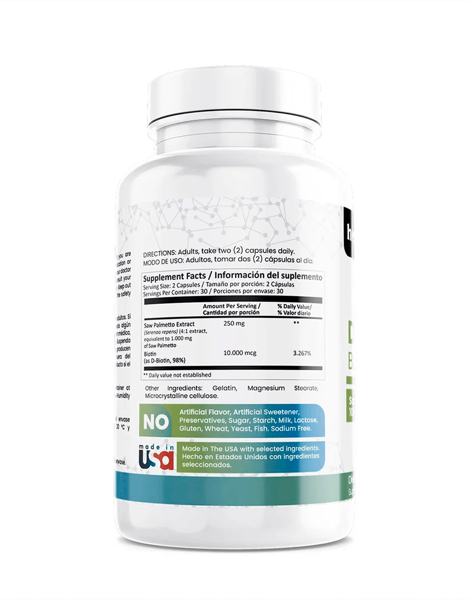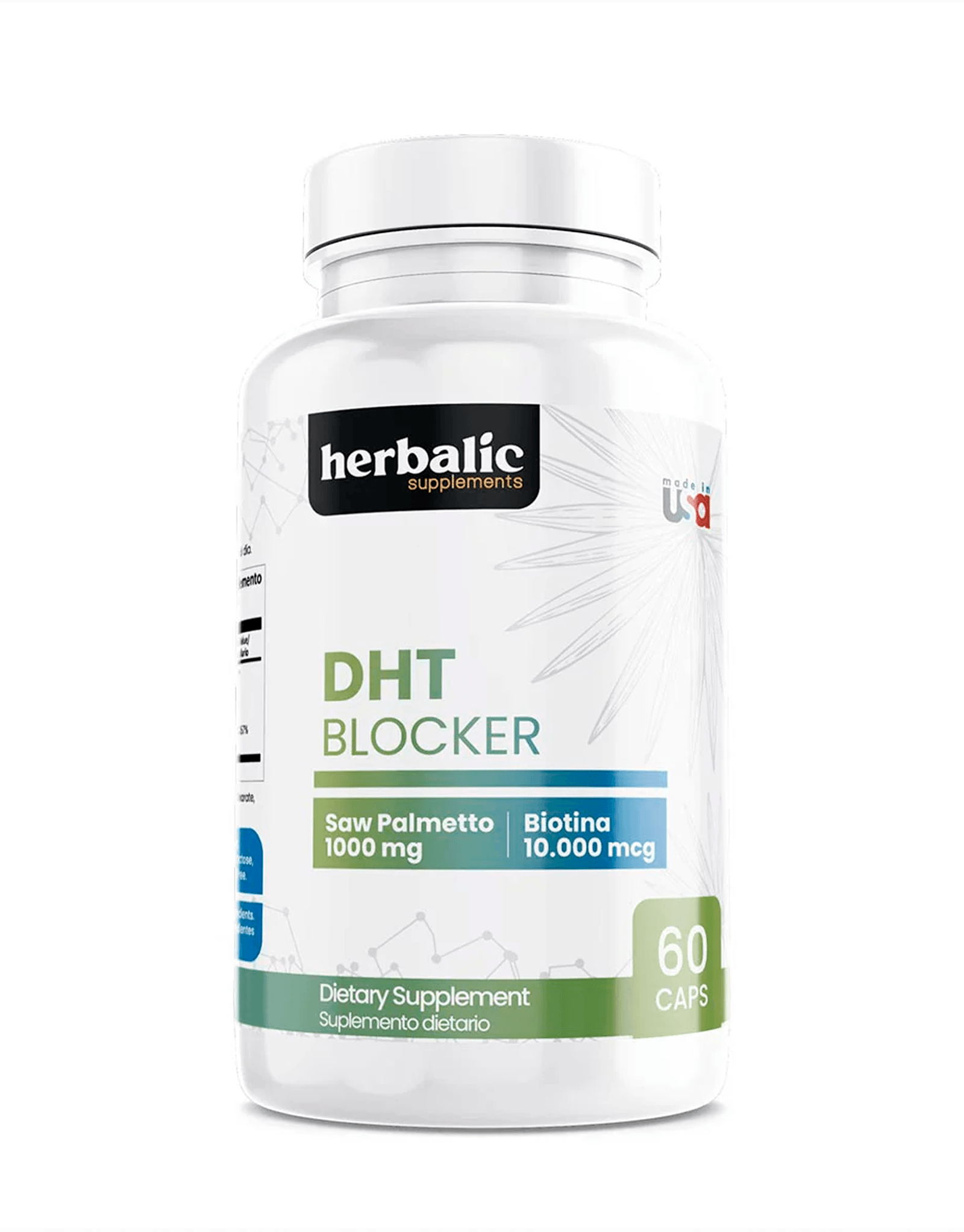 El DHT Blocker de Herbalic Supplements está formulado con Saw Palmetto 1000 mg y Biotina 10.000 mcg, dos potentes ingredientes que ayudan a bloquear la hormona DHT, principal responsable de la caída del cabello y el debilitamiento capilar.