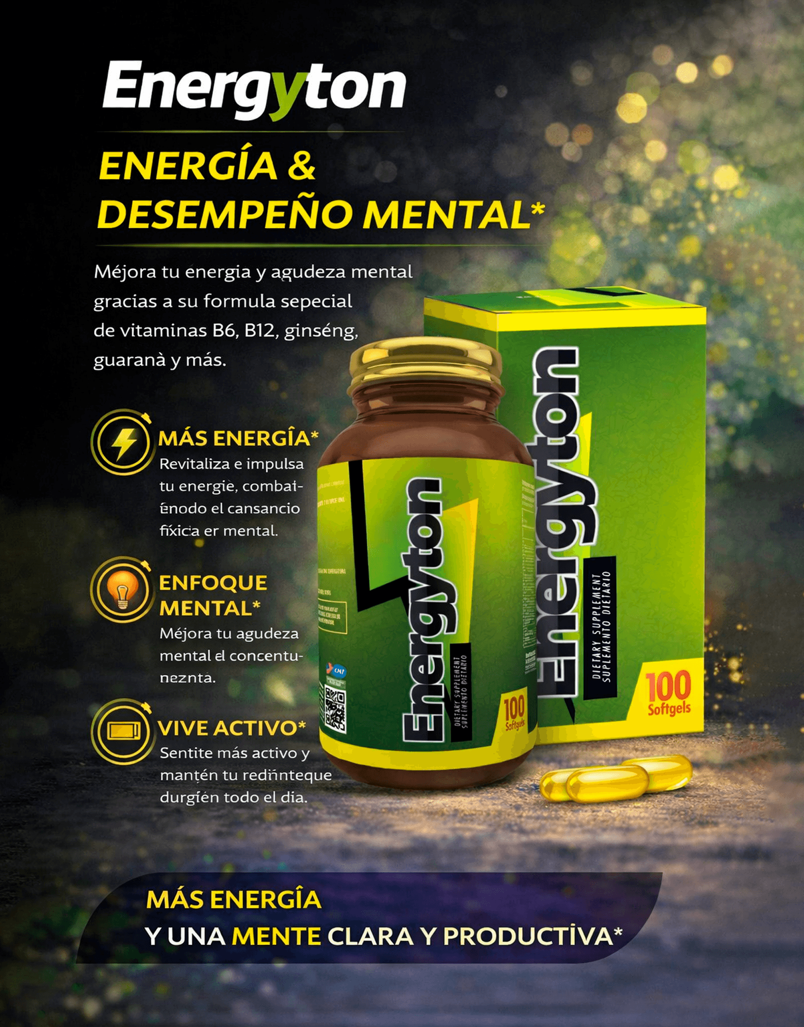 Energyton Plus es una fórmula avanzada que combina vitaminas, minerales y extractos naturales para aumentar tu energía, mejorar el rendimiento físico y mental y ayudarte a combatir el cansancio diario de forma efectiva.