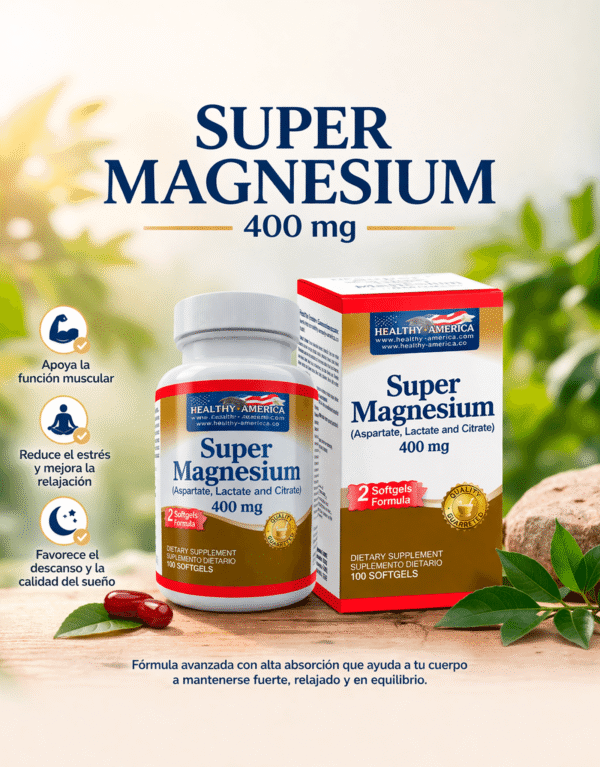 Super Magnesio Healthy America – 400 mg combina tres formas clave de magnesio (aspartato, lactato y citrato) para ofrecerte máxima eficacia en cada dosis.