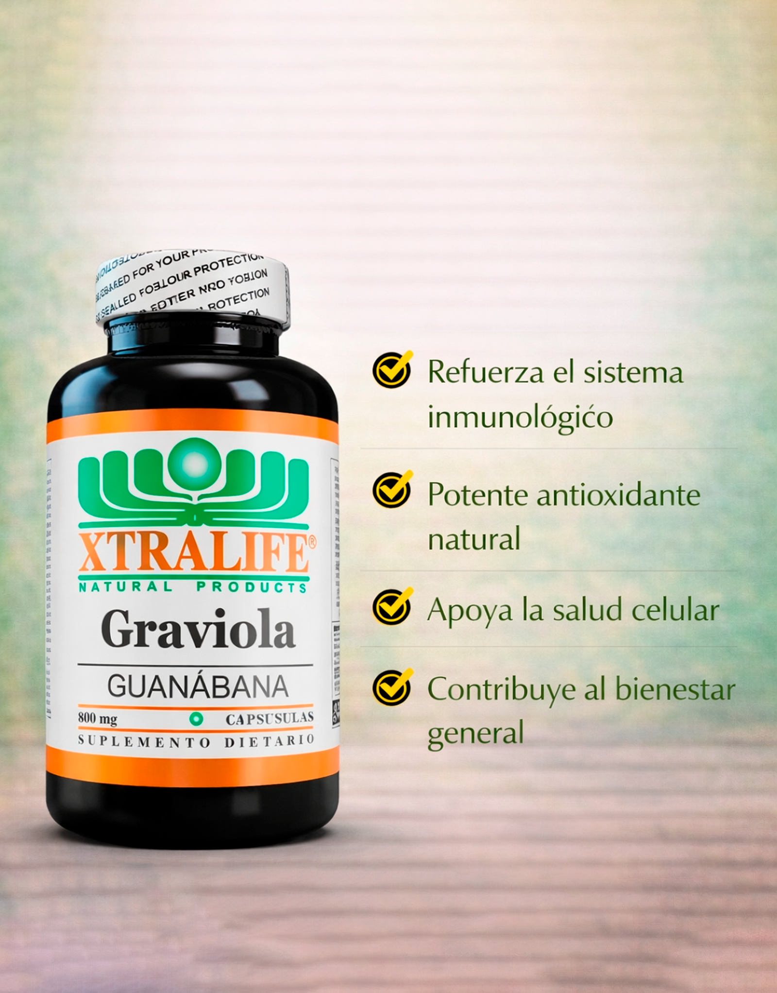 La graviola o guanábana es una planta tradicional conocida por sus propiedades antioxidantes y su capacidad para apoyar el sistema inmunológico. Este suplemento ayuda a fortalecer las defensas naturales del organismo y contribuir al bienestar general, siendo ideal para quienes buscan un complemento natural para mantener su salud y vitalidad.