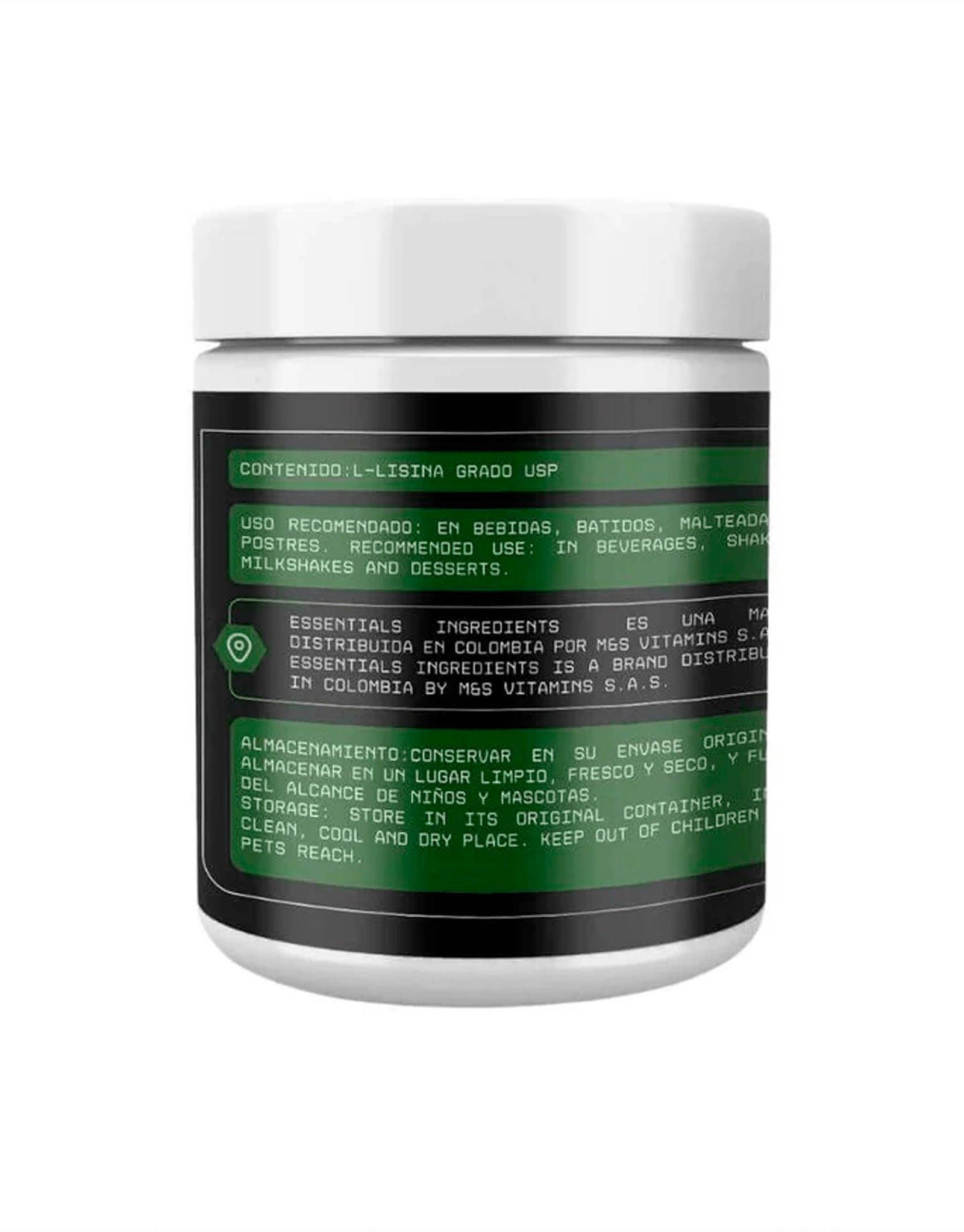 La L-Lisina de Essentials Ingredients es una materia prima 100% pura que juega un papel clave en la formación de proteínas, colágeno y enzimas esenciales.