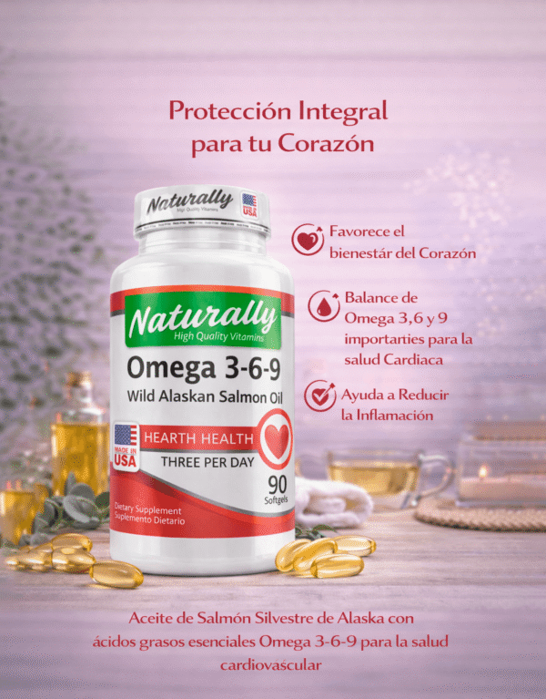 El Omega 3-6-9 de Naturally combina tres aceites esenciales (Omega 3, 6 y 9) de alta pureza provenientes del aceite de salmón salvaje de Alaska, ideal para proteger el corazón, mejorar la circulación y mantener la salud general del organismo.