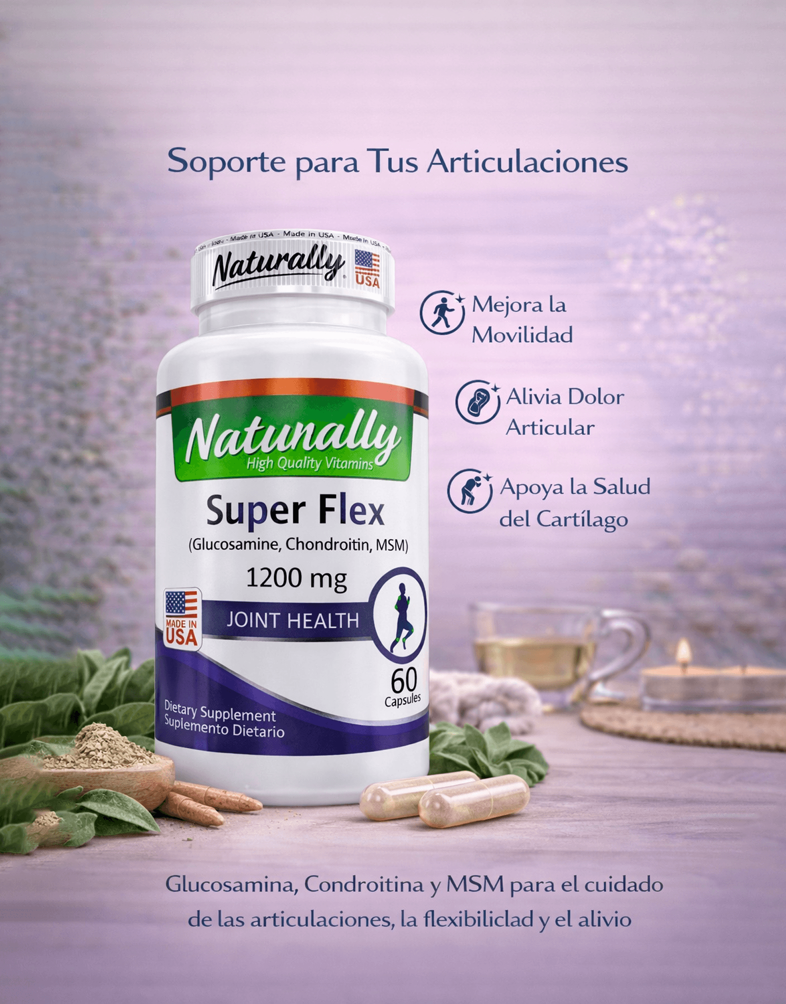 El Super Flex de Naturally combina tres poderosos ingredientes —Glucosamina, Condroitina y MSM— para brindar un soporte completo a tus articulaciones, mejorar la flexibilidad y aliviar la molestia causada por el desgaste articular.