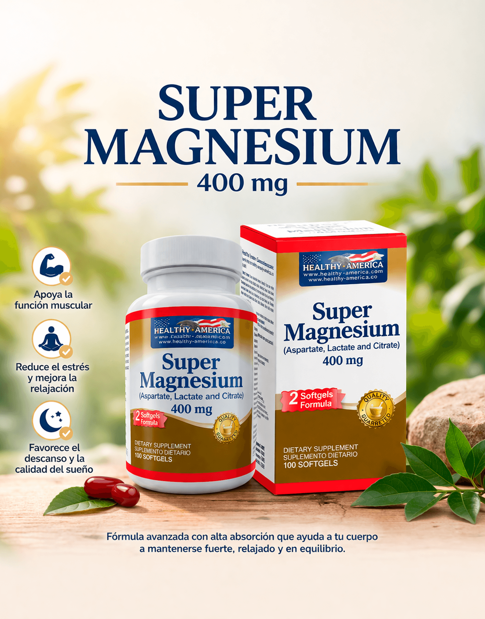 Super Magnesio Healthy America – 400 mg combina tres formas clave de magnesio (aspartato, lactato y citrato) para ofrecerte máxima eficacia en cada dosis.