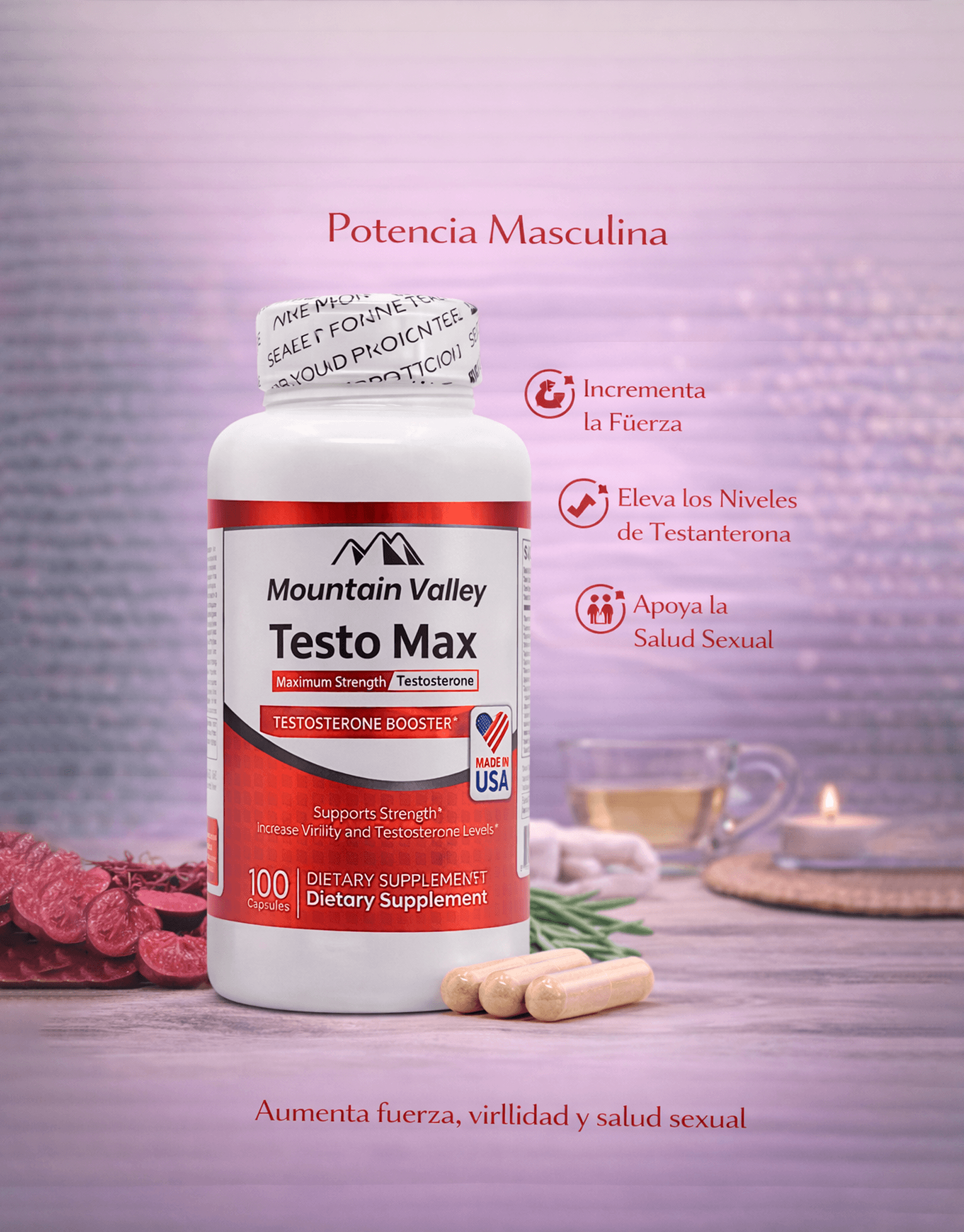 Testo Max de Mountain Valley es un potente estimulante natural de la testosterona, diseñado para aumentar la fuerza, energía, vitalidad y rendimiento físico.