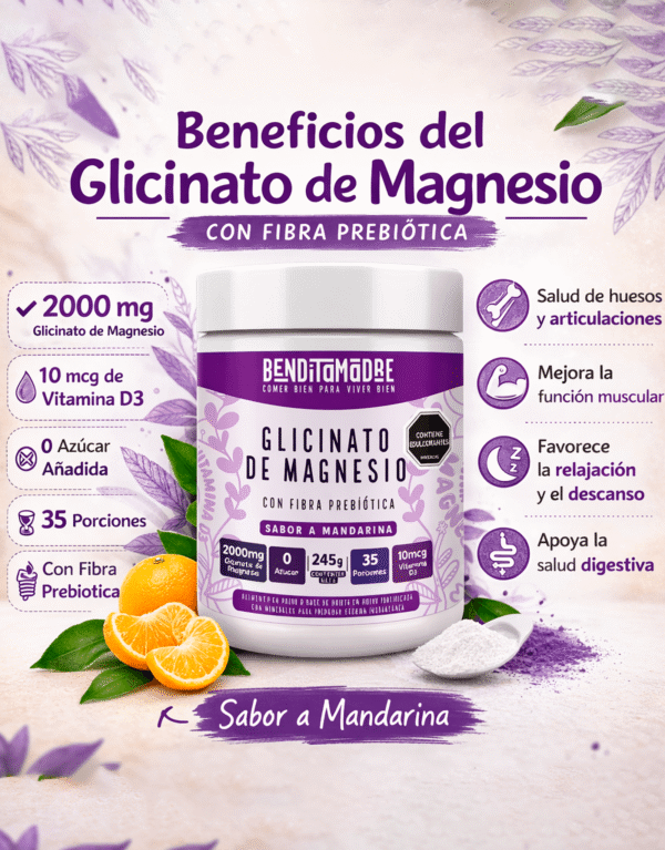 El Glicinato de Magnesio con fibra prebiótica de BenditaMadre es una deliciosa y poderosa fórmula diseñada para relajar los músculos, reducir el estrés y mejorar el sueño de manera natural.
